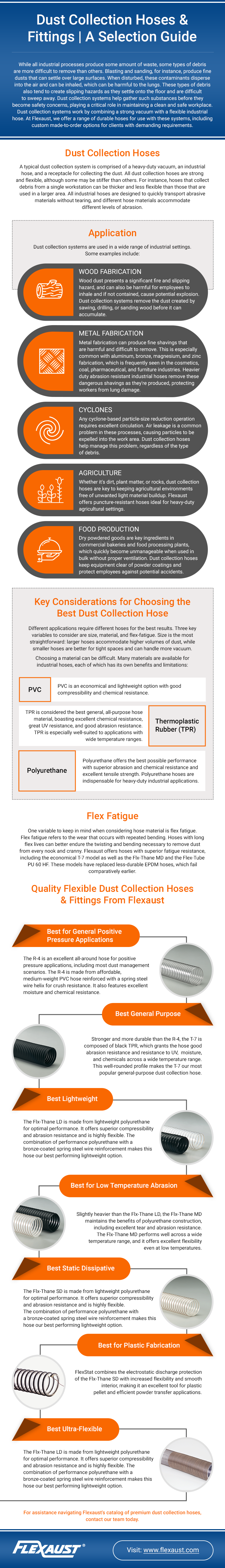 Flexaust cuenta con una amplia variedad de mangueras de recolección de polvo construidas para diversas aplicaciones. Nuestros mejores modelos incluyen: